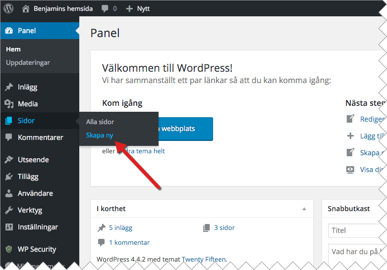 Afin de construire votre site Web dans WordPress, nous commençons à partir du panneau d’administration. Connectez-vous à votre compte en ajoutant /wp-admin à la fin de votre adresse ou connectez-vous via Loopia Customer Zone. Allez dans « Pages > Créer un nouveau ». ****0